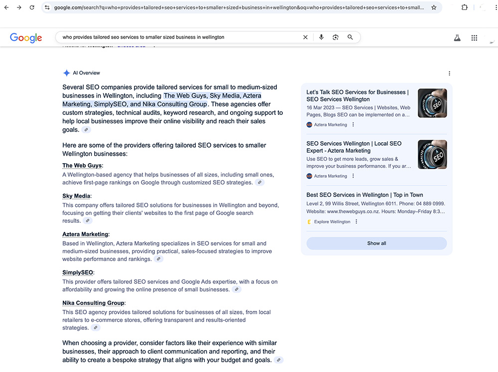 In the Search box I typed in “who provides tailored SEO services to smaller sized businesses in Wellington”, and to the right you can see the main text section, with mini click boxes.